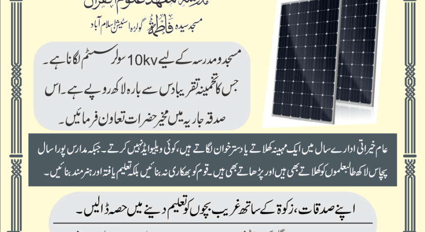 مسجد اور مدرسے کے روزمرہ امور کو بلا تعطل جاری رکھنے اور بجلی کے بھاری اخراجات سے مستقل بچت کے لیے ایک 10 کلو واٹ (10kV) کا سولر سسٹم لگانا بھی انتہائی ضروری ہے۔ اس اہم پراجیکٹ کا تخمینہ تقریباً 10 سے 12 لاکھ روپے ہے۔ روشنی کا یہ بندوبست ایک ایسا صدقہ جاریہ ہے جس کا ثواب آپ کو ہر اس وقت ملتا رہے گا جب جب اللہ کے گھر اور مدرسے میں عبادات اور قرآن کی تلاوت ہوگی۔ مخیر حضرات سے گزارش ہے کہ اس مد میں بھی بھرپور تعاون فرمائیں۔